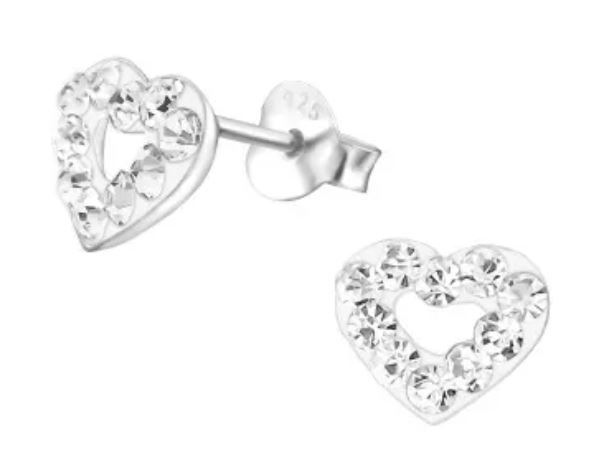 Kauniit ja sirot sydänkorvakorut ovat koristeltu pienillä läpinäkyvillä cubic zirkonia kivillä. Hopeakorvakorvakorujen koko on 6 x 6 mm. Korvakoruissa on napakka nappikiinnitys.