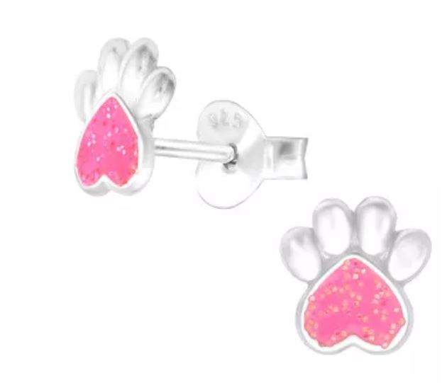 Hopeiset ihanat tassukorvakorut ovat emaloitu vaaleanpunaiseksi ja niissä on kimalletta. Hopeakorvakorujen koko on 6 x 6 mm. Korvakoruissa on napakka nappikiinnitys.