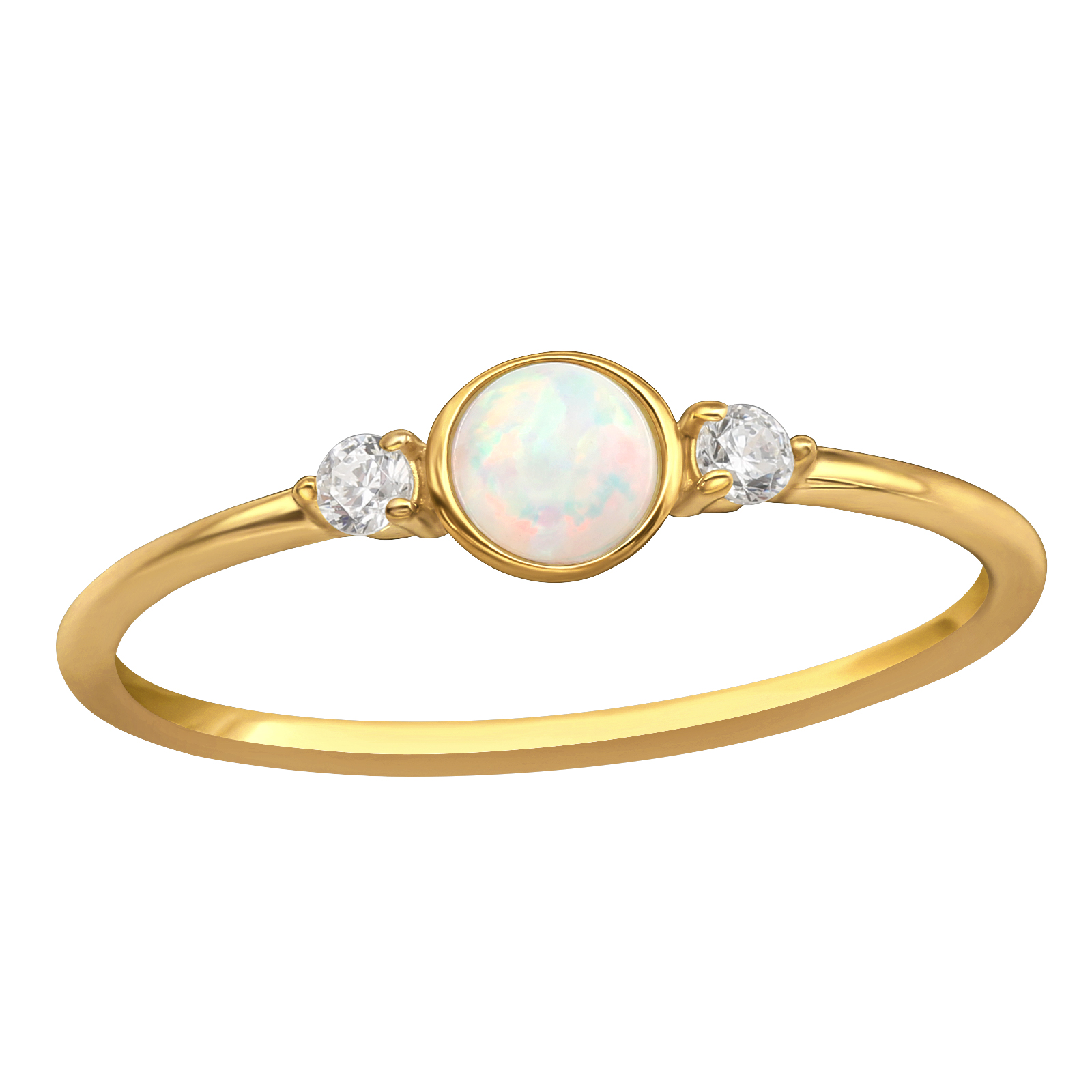 Kaunis kullattu hopeasormus synteettisellä opaalilla ja cubic zirkonia kivillä.
