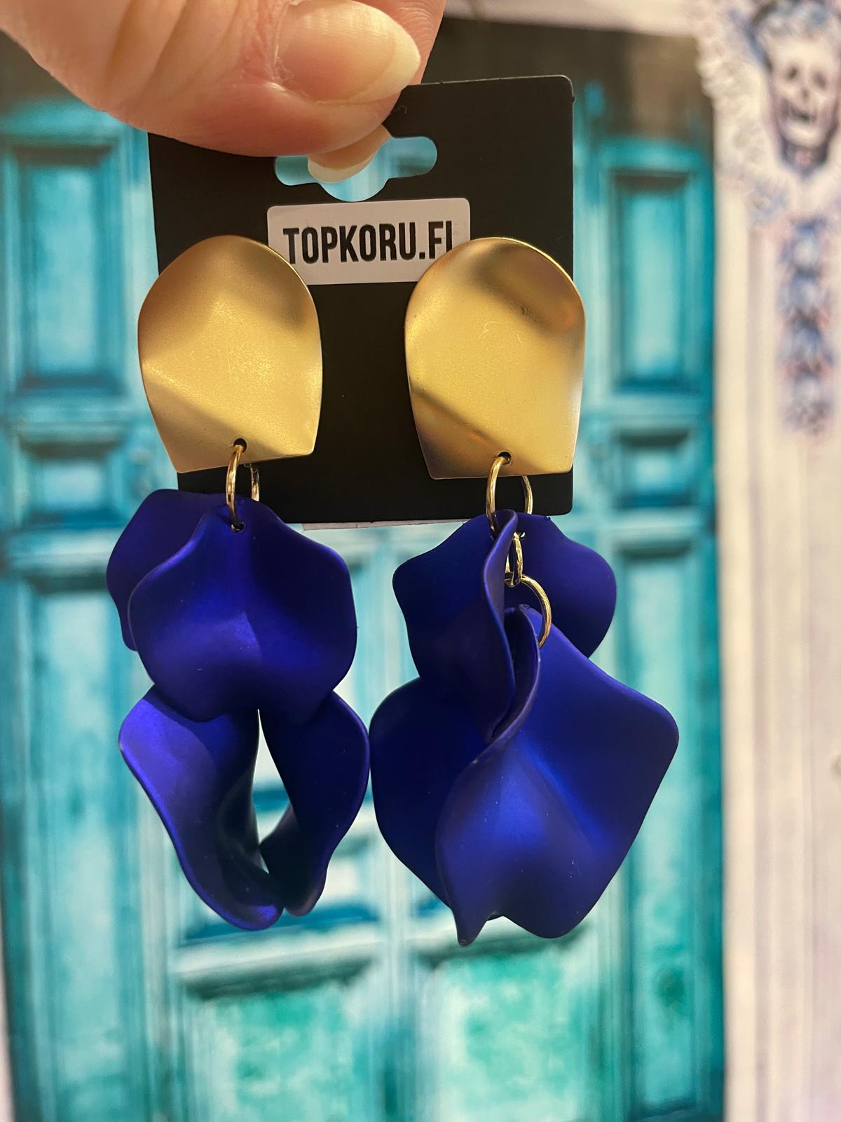 Upeat ja kevyet siniset lehtikorvakorut tappikiinnityksellä. Korvakorut ovat valmistettu muovimassasta. Nämä korvakorut kruunaavat asukokonaisuutesi. Metalliosat ovat nikkelivapaita. Korvakorujen pituus 8 cm.