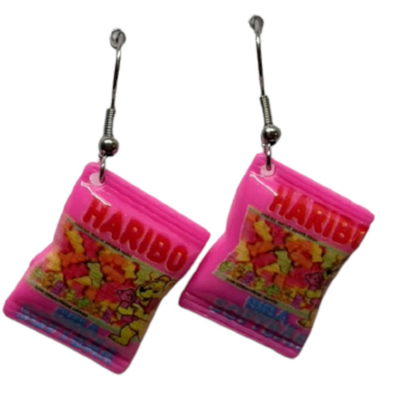 Hauskat ja kevyet pinkit karkkipussikorvakorut. Koko 22 X 18 mm. Pussi on valmistettu muovimassasta.