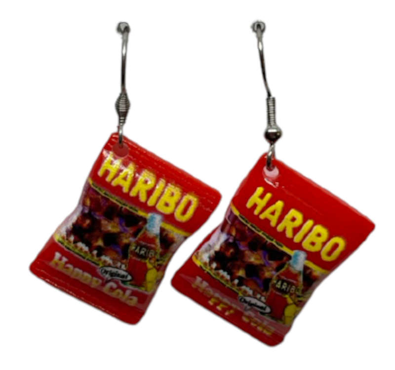 Hauskat ja kevyet punaiset karkkipussikorvakorut. Koko 22 X 18 mm. Pussi on valmistettu muovimassasta.