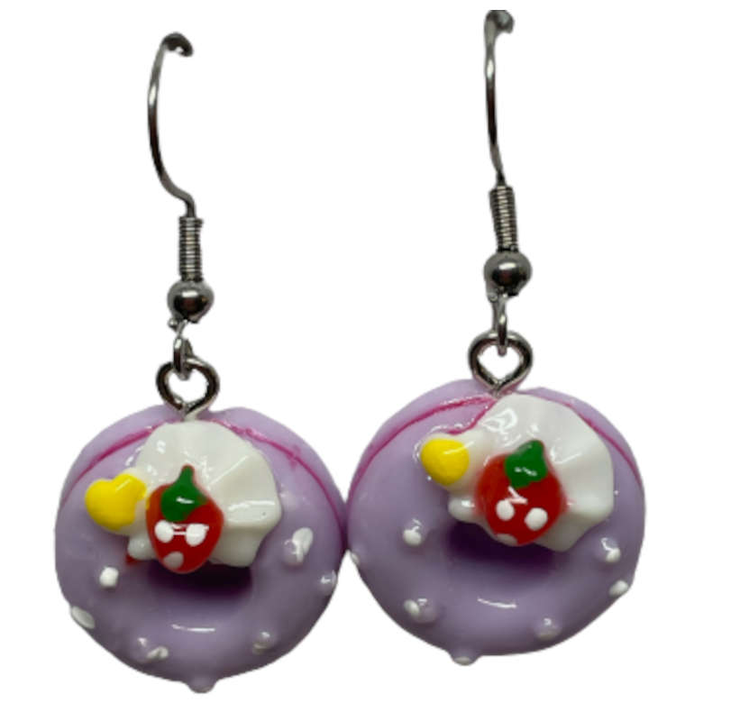 Hauskat ja kevyet lilat donitsi korvakorut. Koko 15 X 15 mm. Donitsi on valmistettu muovimassasta.