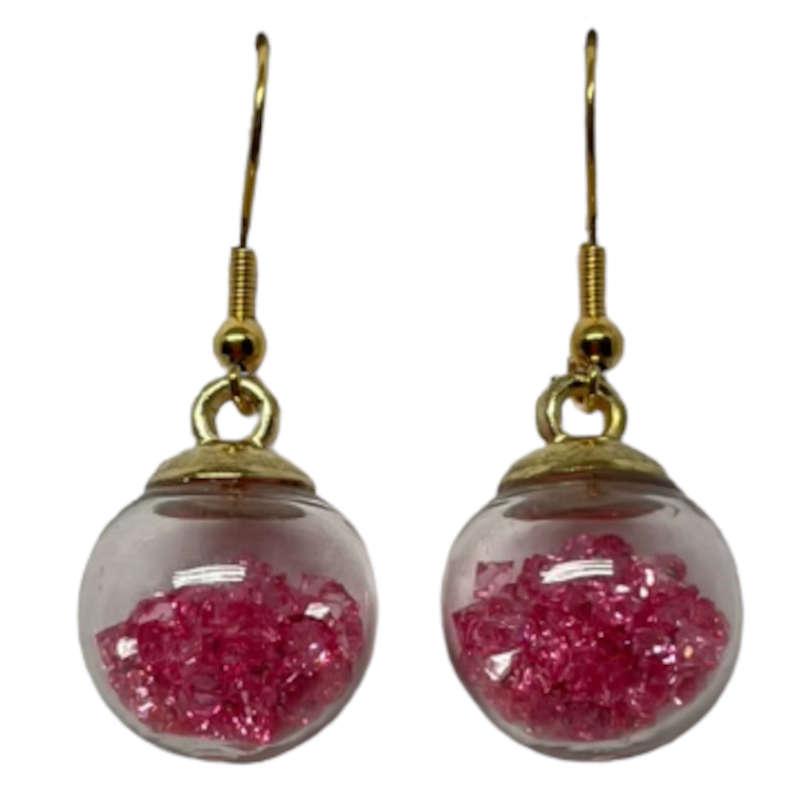 Kauniit ja kevyet lasipallokorvakorut jonka sisällä on säihkyviä läpinäkyviä kiviä. Koko 16 X 16 mm.