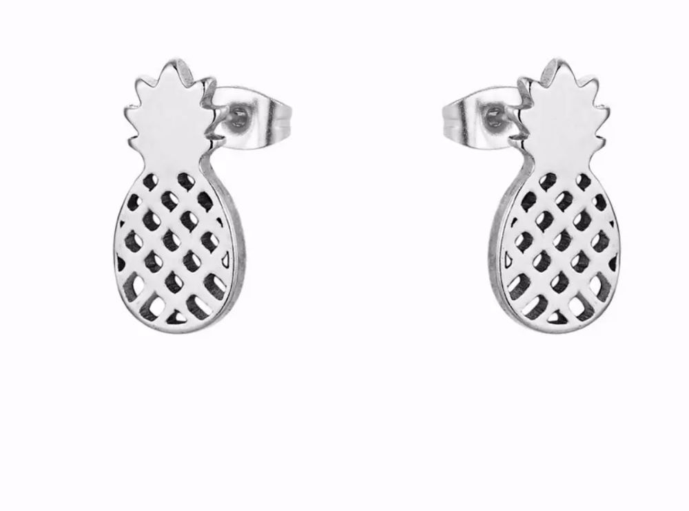 Teräksenväriset ananasnappikorvakorut. Korvakorujen mitat 10 X 5 mm. Korvakorut ovat ruostumatonta terästä ja allergiavapaita. Teräskorut eivät tummu käytössä esim. veden kosketuksessa tai ajan kuluessa.
